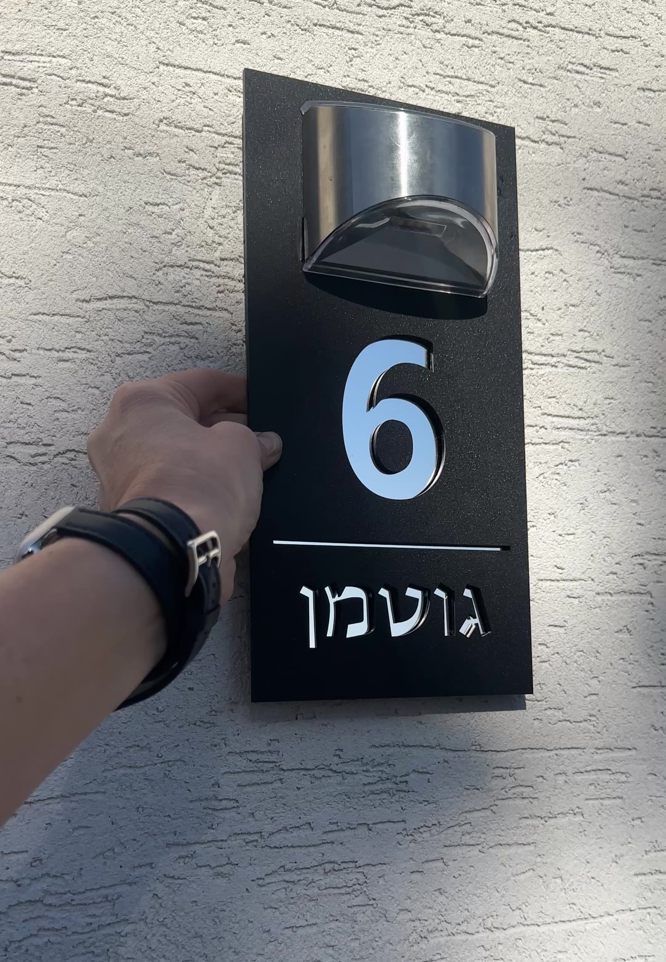 שלט משפחה לכניסה לבית, מאקריליק שחור ותאורה סולארית