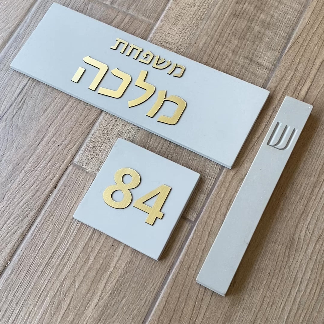 סט שלט+מספר+מזוזה אפור-אותיות זהב