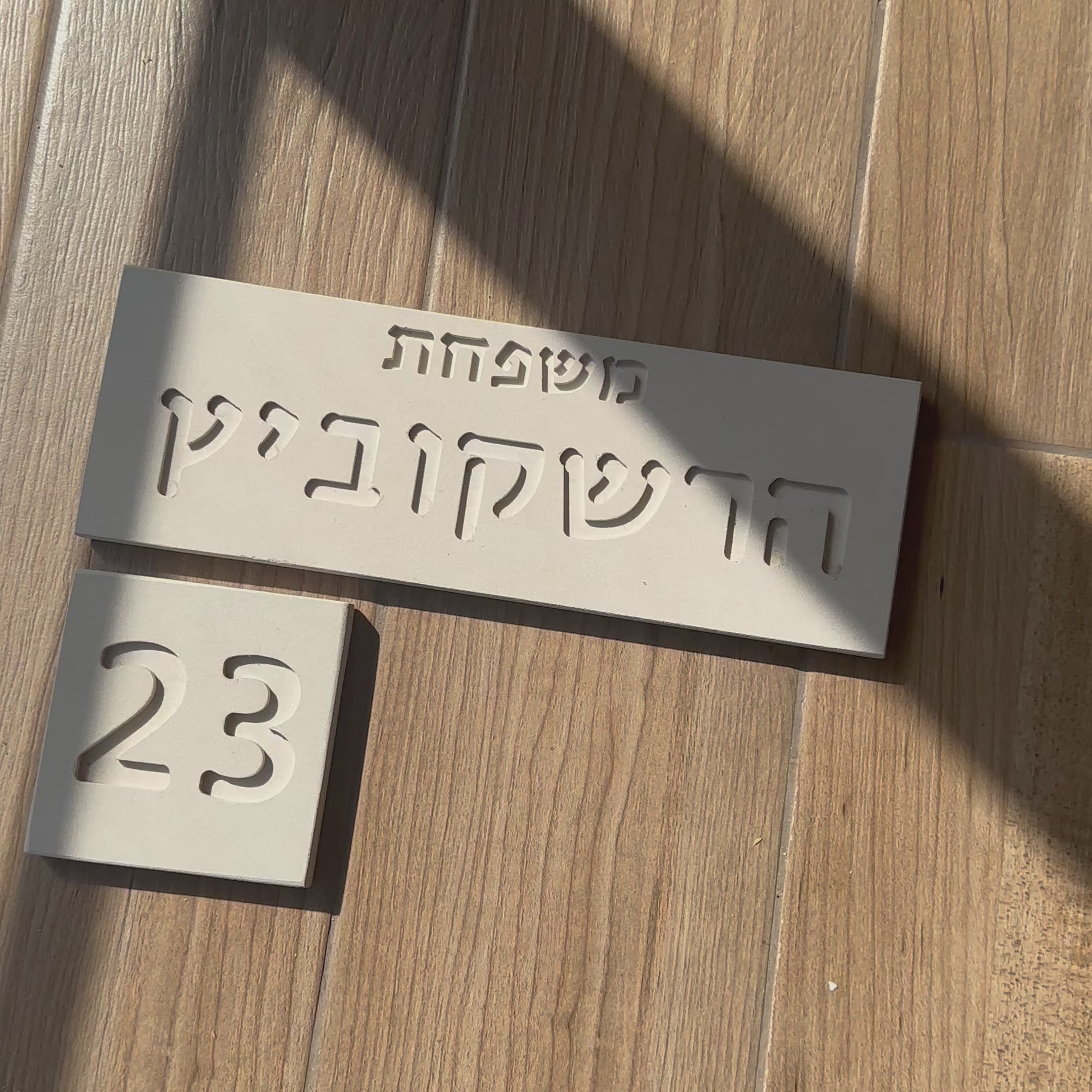 שלט משפחה לכניסה לבית בצביעה לבנה עם חריטת בטון של שם משפחה ע”פ הזמנה.